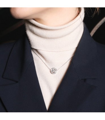 Chaîne pendentif en or blanc, maille forçat, centrée d'un diamant en serti griffe dans un entourage de diamants.