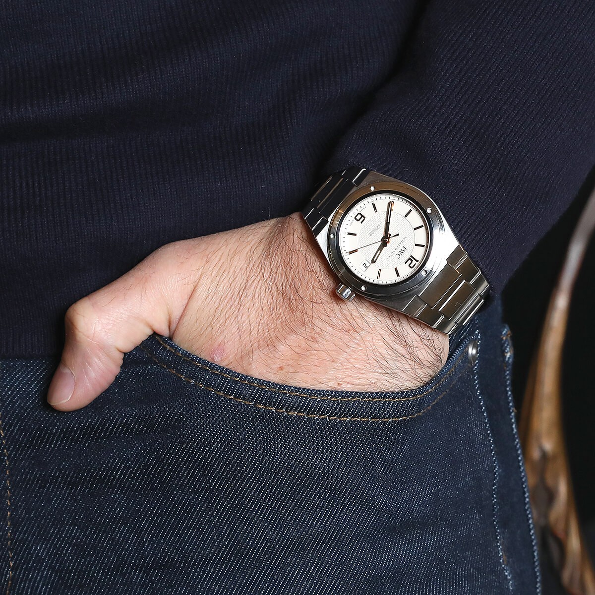 Montre bracelet d’homme en acier, cadran crème avec chiffres arabes et index appliqués, chemin de fer pour les minutes, affichage de la date par guichet à 3 heures. Fond de boîte transparent dévoilant son mouvement automatique. Bracelet en acier avec boucle déployante en acier. Signée et numérotée.