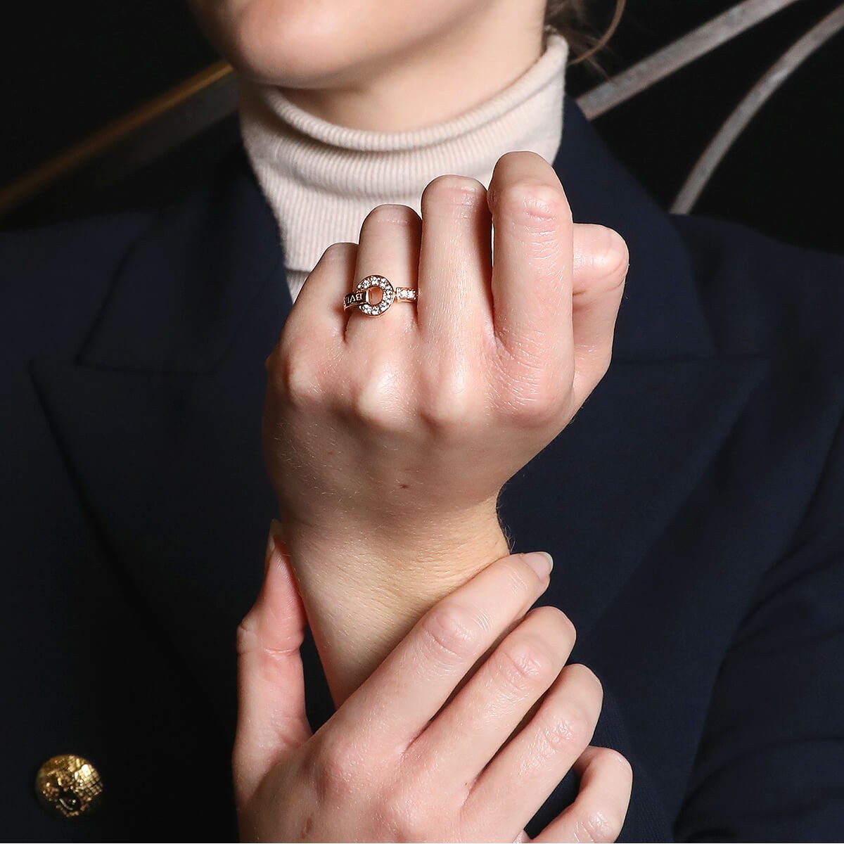 Bague en or rose, à décor géométrique ajouré partiellement rehaussé de diamants gravé “Bvlgari”. Signée.