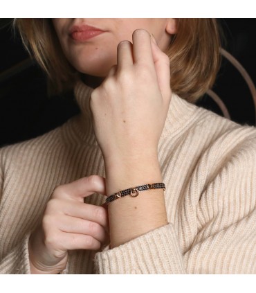 Bracelet en or rose petit modèle, serti de spinelles noirs, orné de 2 motifs de clous de Paris centrés d’un anneau mobile. Signé et numéroté.