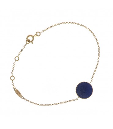 Bracelet en or jaune, maille forçat, centré d’un motif “rose des vents” rehaussé d’un disque de lapis lazuli, le motif central ponctué d’un diamant, agrémenté d’un fermoir anneau ressort avec longueur réglable. Signé et numéroté.