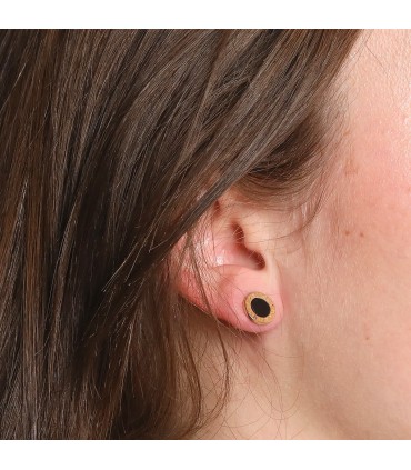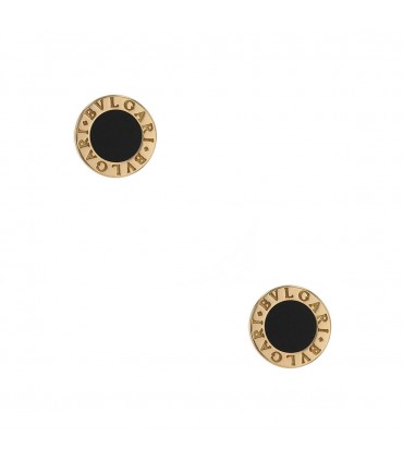 Boucles d’oreilles en or jaune, gravées du double logo “Bvlgari” et centrées d’un motif circulaire en onyx. Signées.
