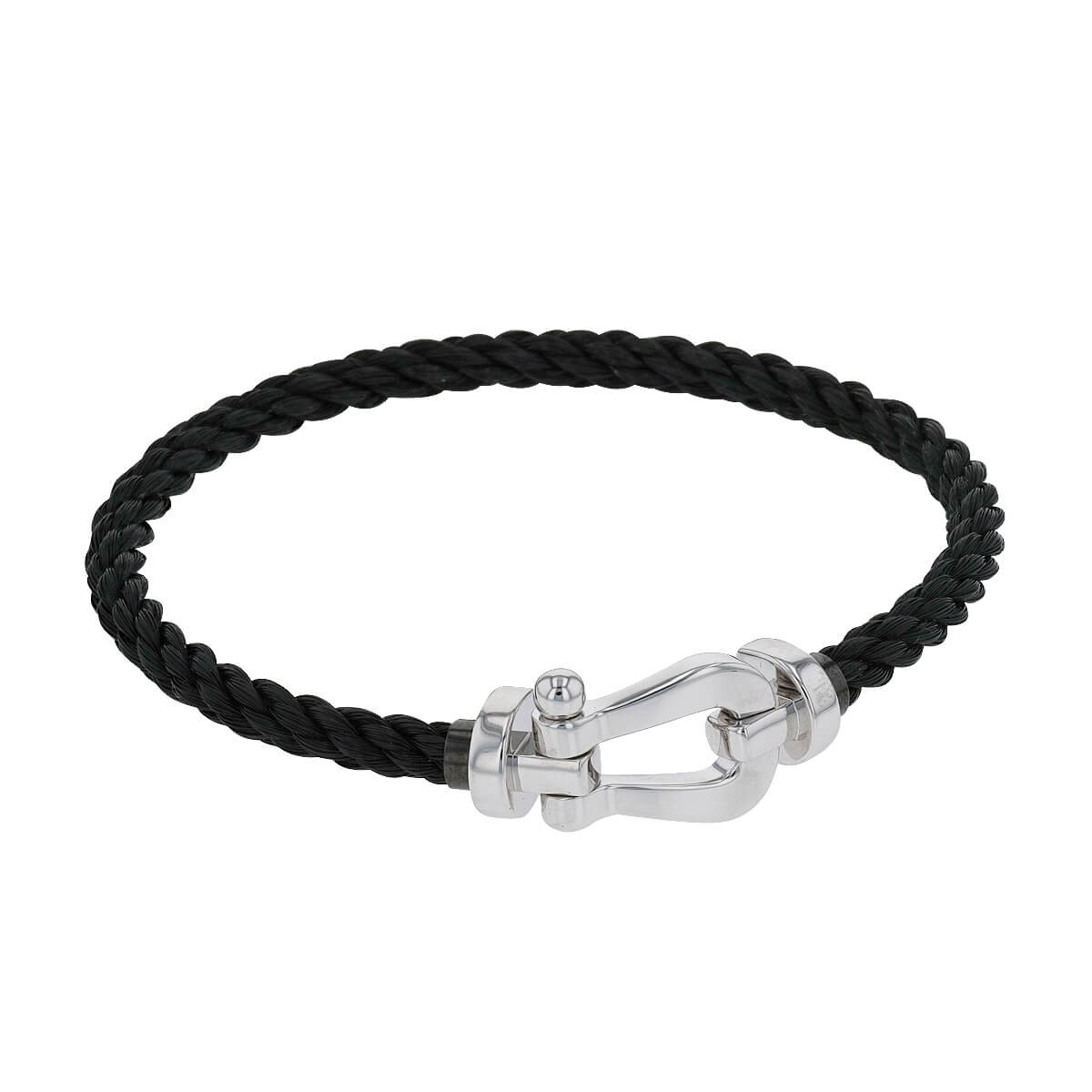 Bracelet grand modèle, composé d’une manille en or blanc et d’un câble amovible noir torsadé. Signé et numéroté.