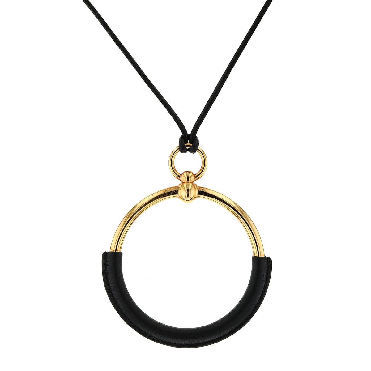 Collier en métal doré, retenant par un cordon en cuir noir un motif circulaire en plaqué or partiellement recouvert de cuir. Signé.