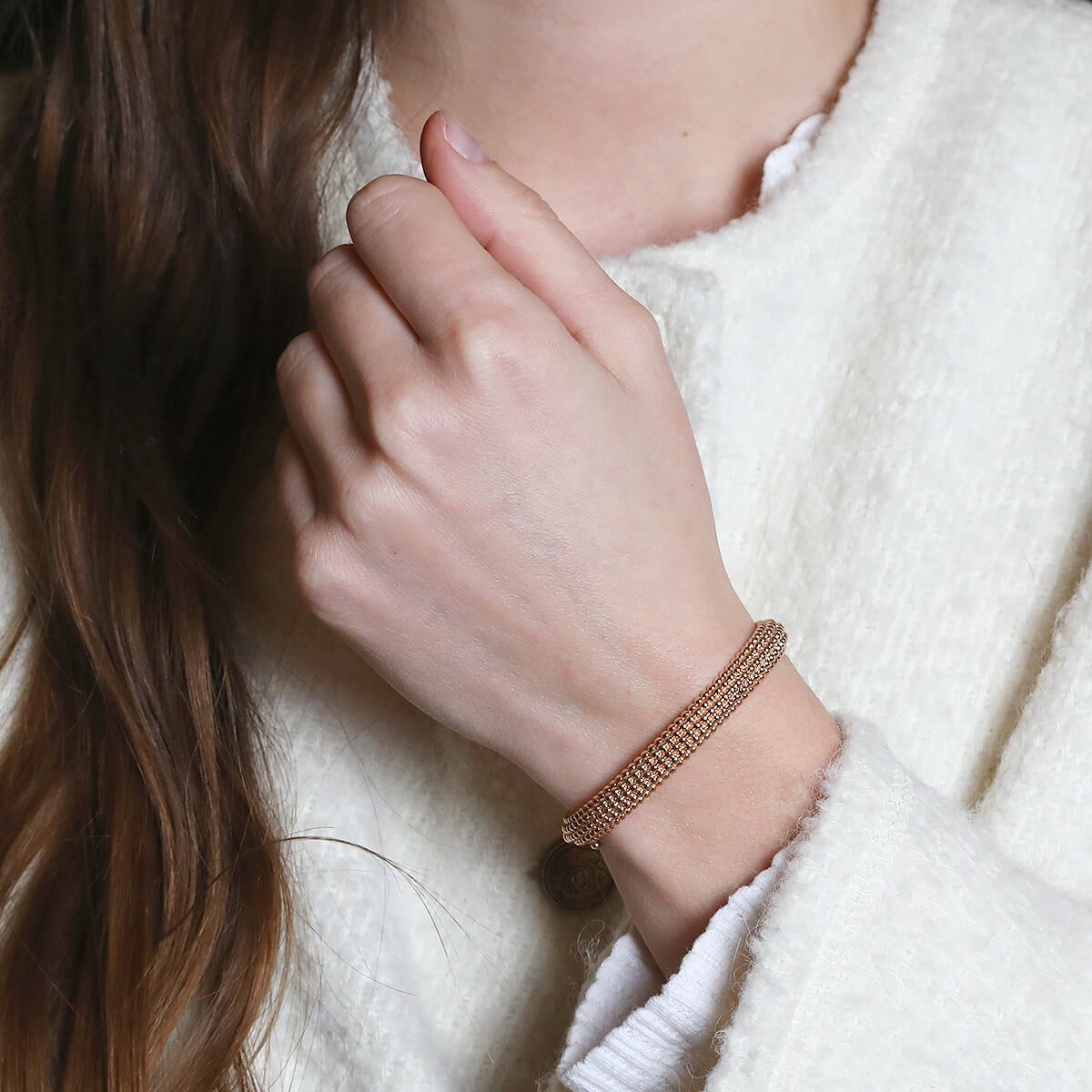 Bracelet rigide ouvrant en or rose, composé de 5 rangs de motifs perlés, agrémenté d’un fermoir invisible à cliquet avec sécurité. Signé et numéroté.