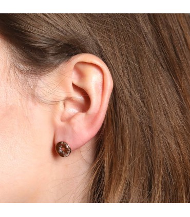 Boucles d’oreilles en or rose, stylisant un motif géométrique ajouré partiellement serti de diamants. Signée.