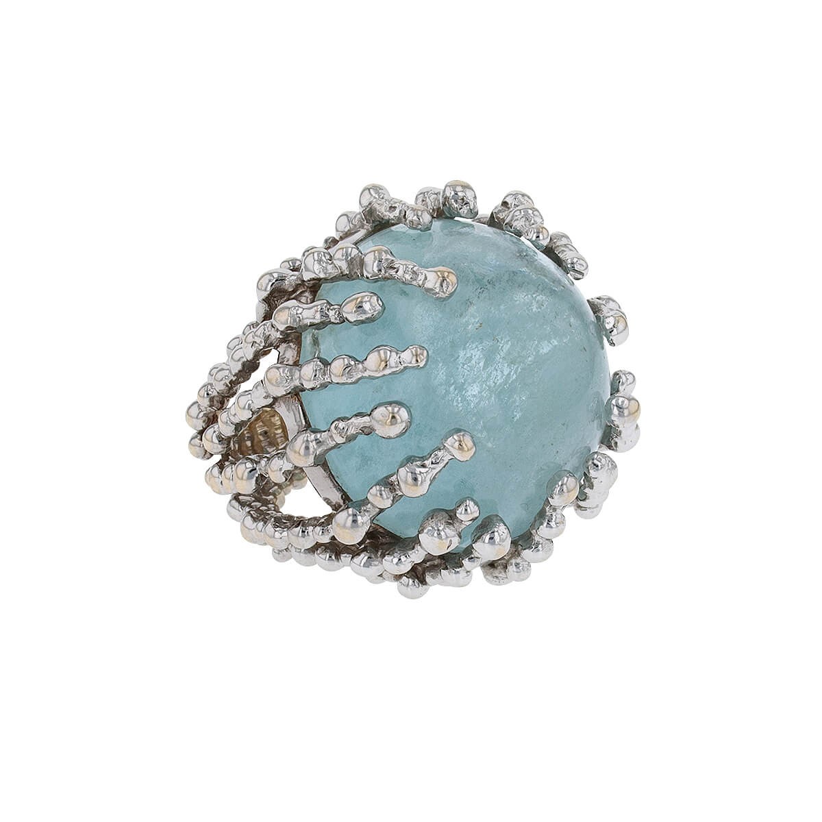 Bague en or blanc, à décor ajouré perlé retenant une importante aigue-marine taillée en cabochon.