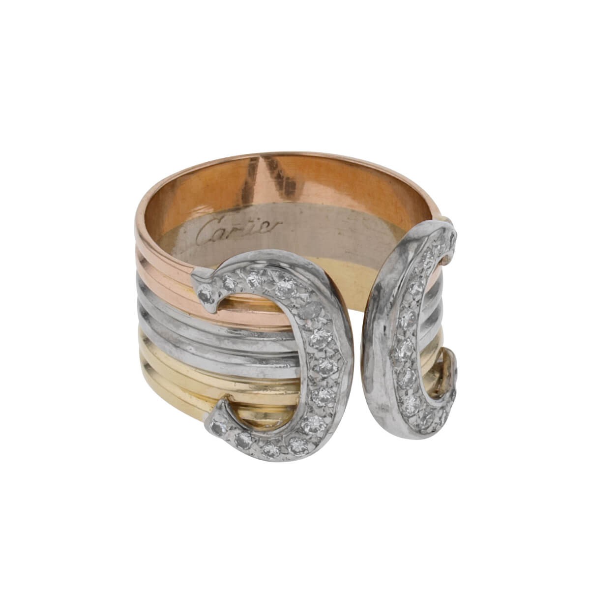 Bague ouverte 3 tons d'or, les embouts ornés du monogramme au double “C” de la maison Cartier rehaussé de diamants. Signée et numérotée.