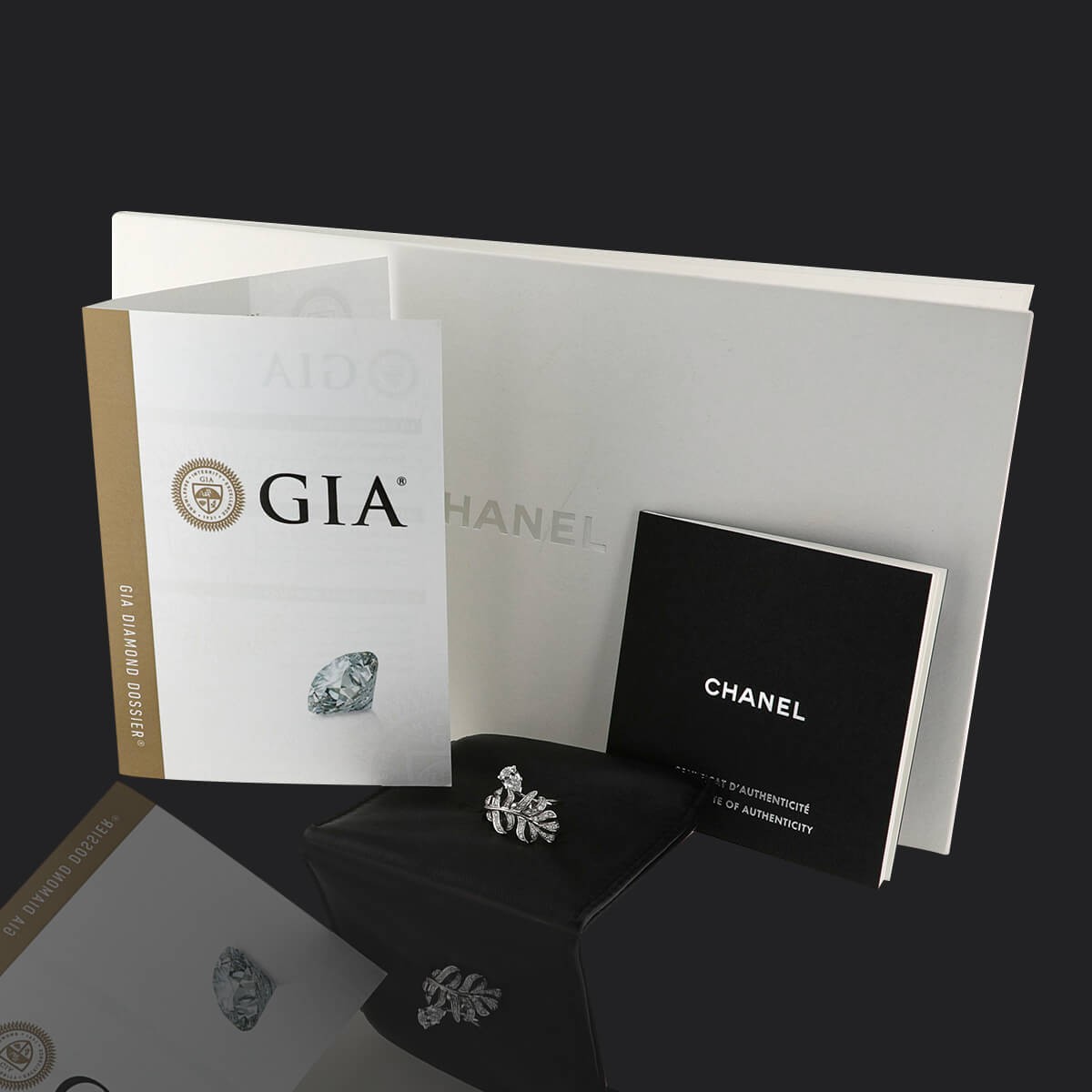 Bague en or blanc, centrée d’un motif de plume en relief serti de diamants soulignée d’un diamant taille poire de 0,52 ct. Accompagnée d’un certificat GIA attestant d’un diamant de 0,52 ct, couleur E, pureté VVS1. Signée et numérotée.