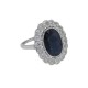 Bague en platine, centrée d’un saphir ovale foncé d’environ 3,7 cts dans un entourage de diamants taille ancienne.