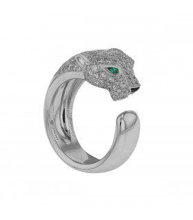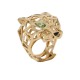 Bague en or jaune, stylisant une panthère ajourée suivant des formes géométriques, les yeux sertis de grenats tsavorites et la truffe en onyx. Signée et numérotée.