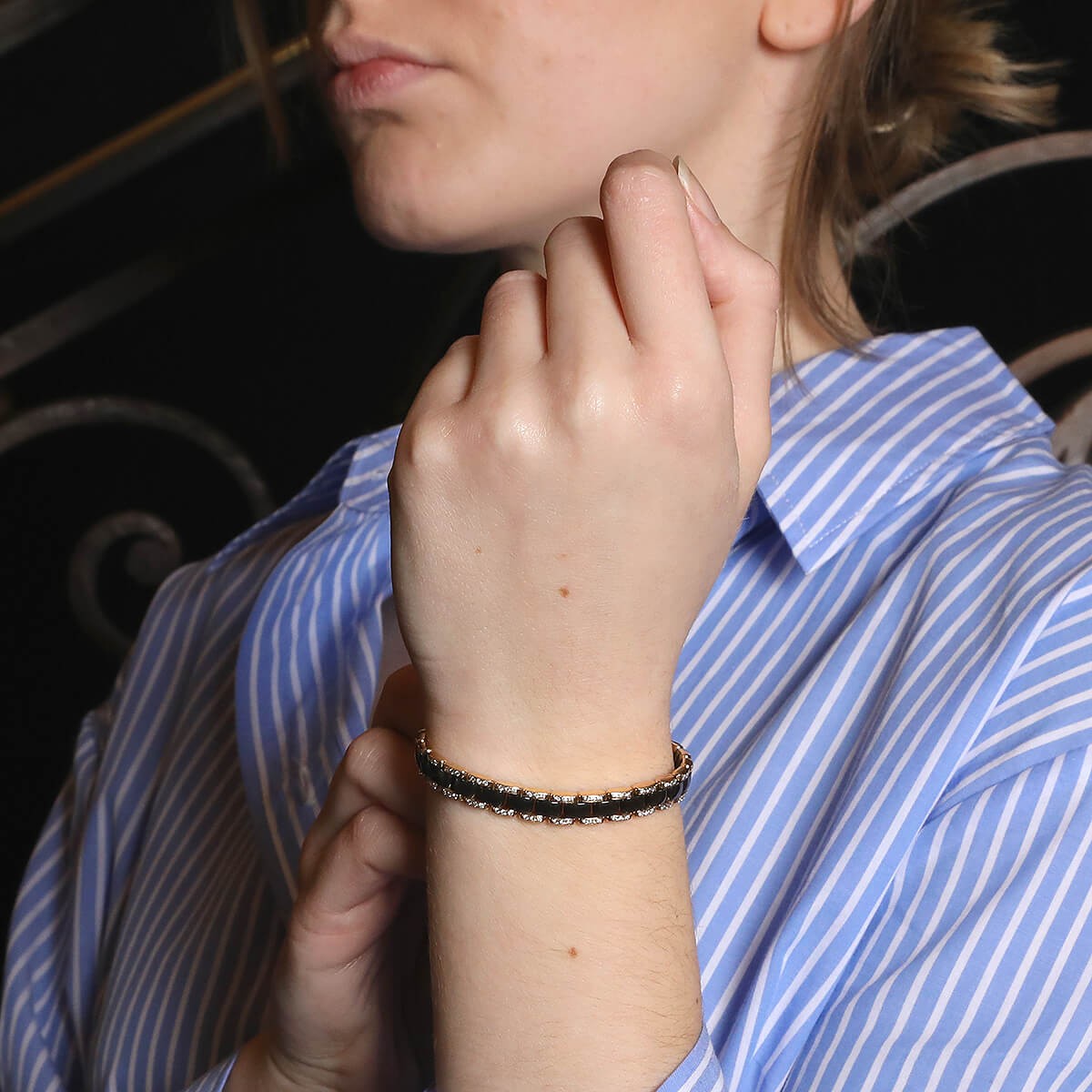 Bracelet composé de maillons articulés en céramique noire et or jaune, sertis de diamants, agrémenté d’un fermoir à cliquet avec huit de sécurité. Signé et numéroté.