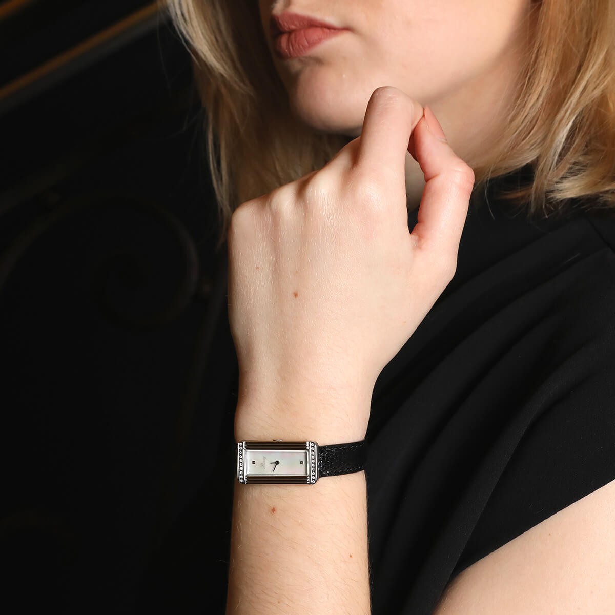 Montre bracelet de femme en acier, cadran en nacre, lunette godronnée ornée de diamants. Mouvement quartz. Bracelet signé neuf en cuir noir avec boucle ardillon en acier. Signée et numérotée.