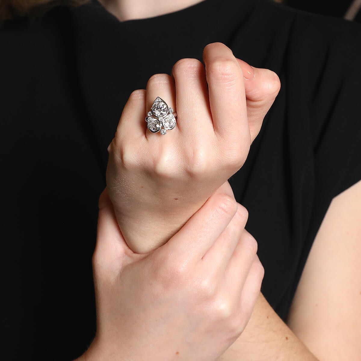 Bague en or blanc, composée de trois motifs de gouttes sertis d’importants diamants taille ancienne surmontés de diamants taille rond facetté.