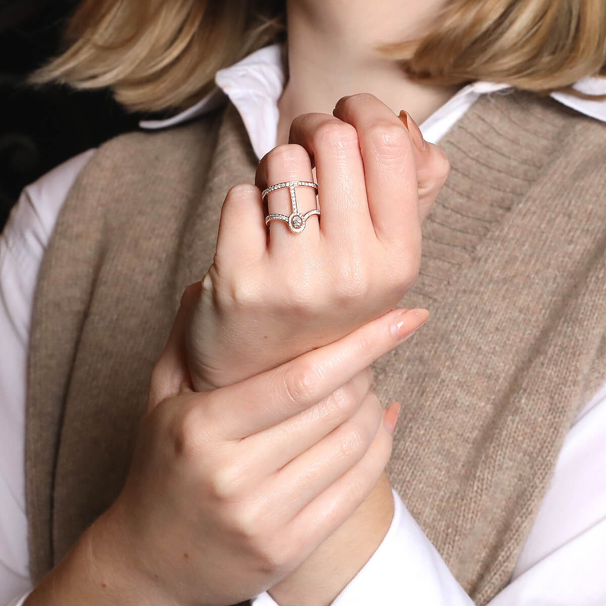 Bague en or rose, à décor ajouré pavé de diamants, orné d’un diamant plus important taillé en poire en serti griffe dans un entourage de diamants. Signée.