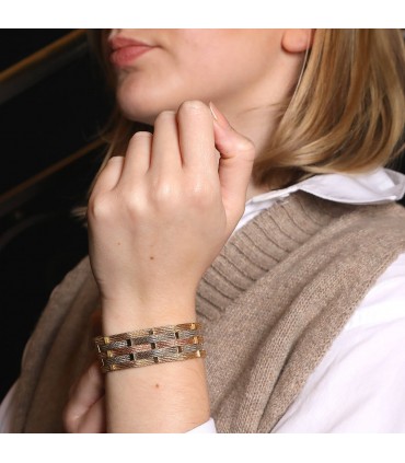 Bracelet 3 tons d’or, composé de 5 rangs en maille d’or tressé retenues par des motifs barrette en or jaune, agrémenté d’un fermoir à cliquet avec double huit de sécurité.