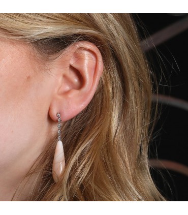 Boucles d’oreilles en or blanc, serties d’une ligne de diamants retenant en pampille un motif oblongue en corail peau d’ange.