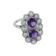 Bague en or blanc, centrée de deux améthystes taille rond facetté dans un entourage de 12 diamants.