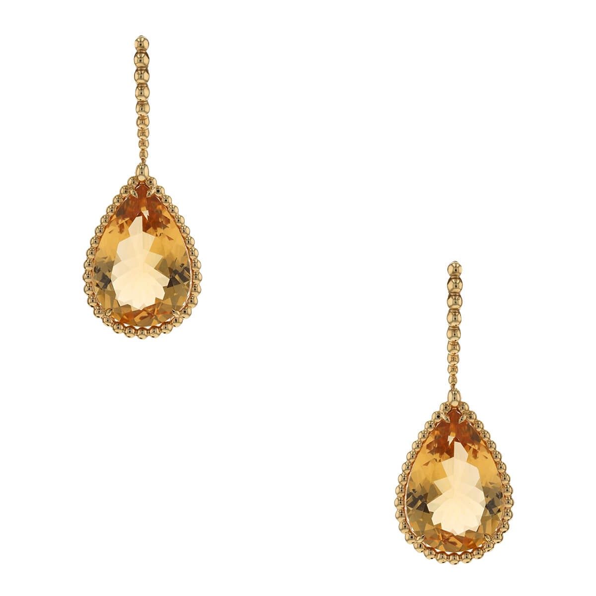 Boucles d’oreilles en or jaune, retenant deux citrines taillées en poire dans un entourage perlé. Signées et numérotées.
