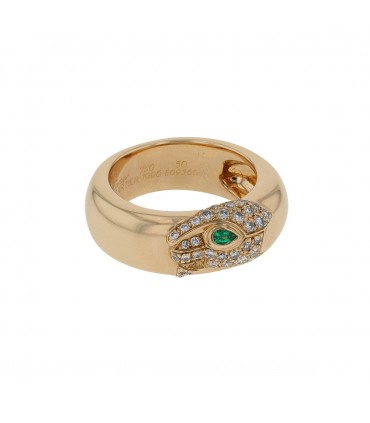 Bague en or jaune, centrée d’une tête de panthère de profil sertie de diamants et rehaussée d’une émeraude taille poire. Signée et numérotée.