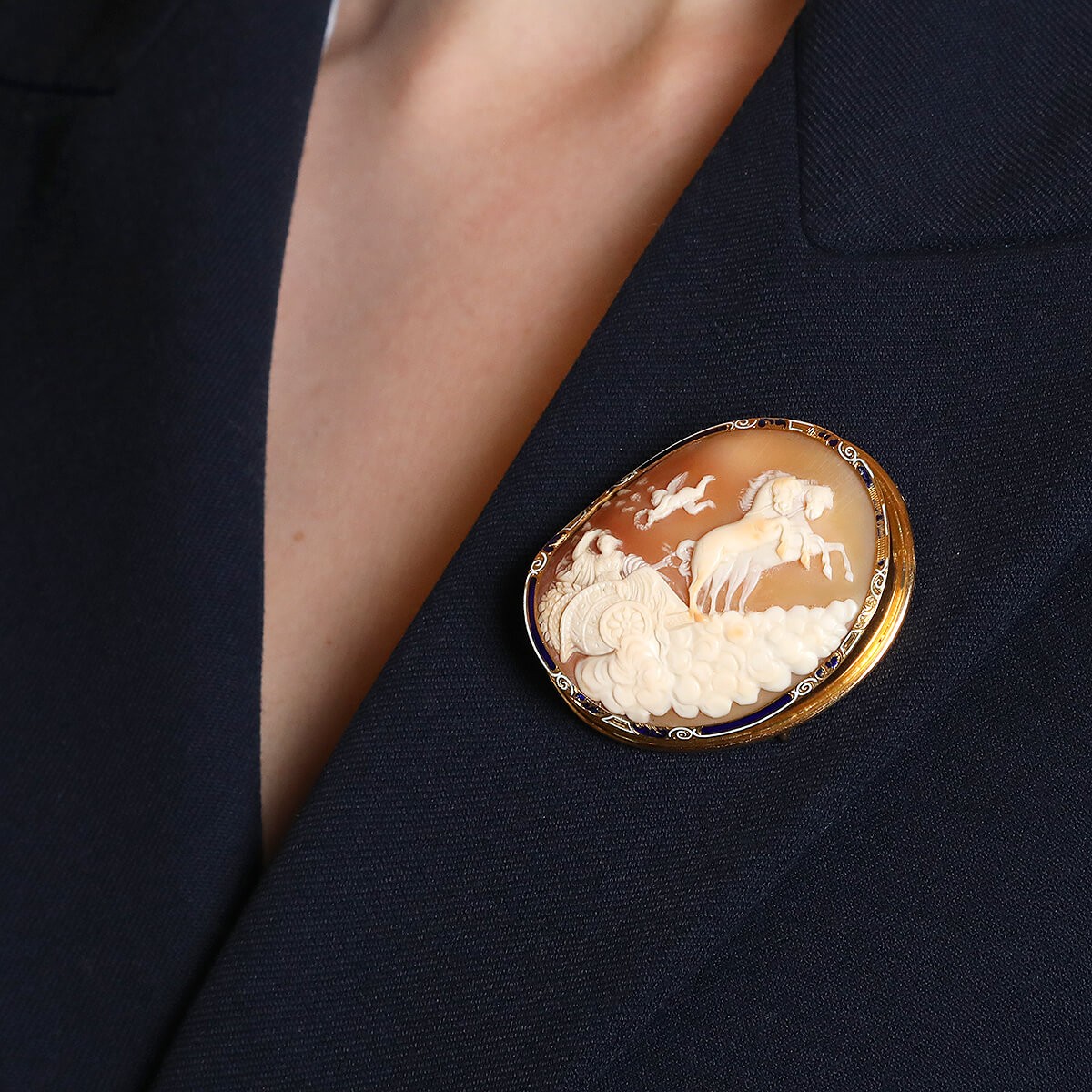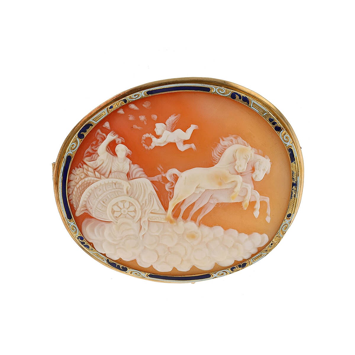 Broche en or jaune, centrée d’un important camée coquillage représentant Vénus sur un char tiré par deux chevaux s’élevant au dessus des nuages, surmontés par Cupidon, serti dans une monture en or et émail à décor de volutes. Manques à l’émail.