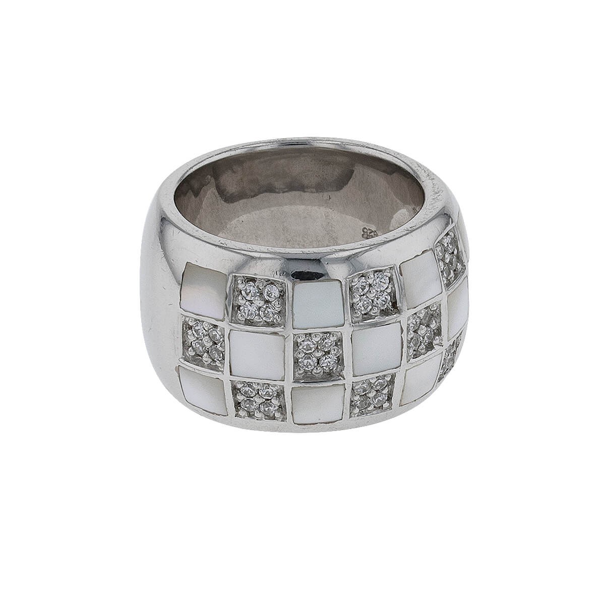 Bague en argent, centrée d’un quadrillage en nacre et pierres blanches.