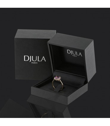Bague en or rose, centrée d’une améthyste taille coussin dans un entourage de diamants. Signée.