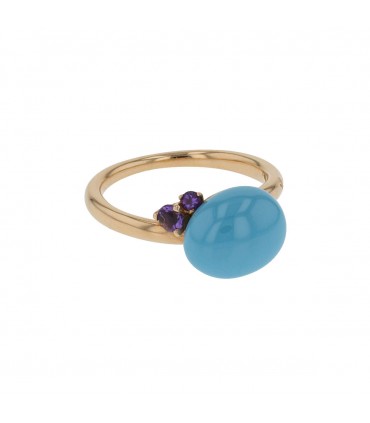 Bague en or rose, ornée d’un cabochon en céramique turquoise rehaussé de trois améthystes facettées. Signée et numérotée.