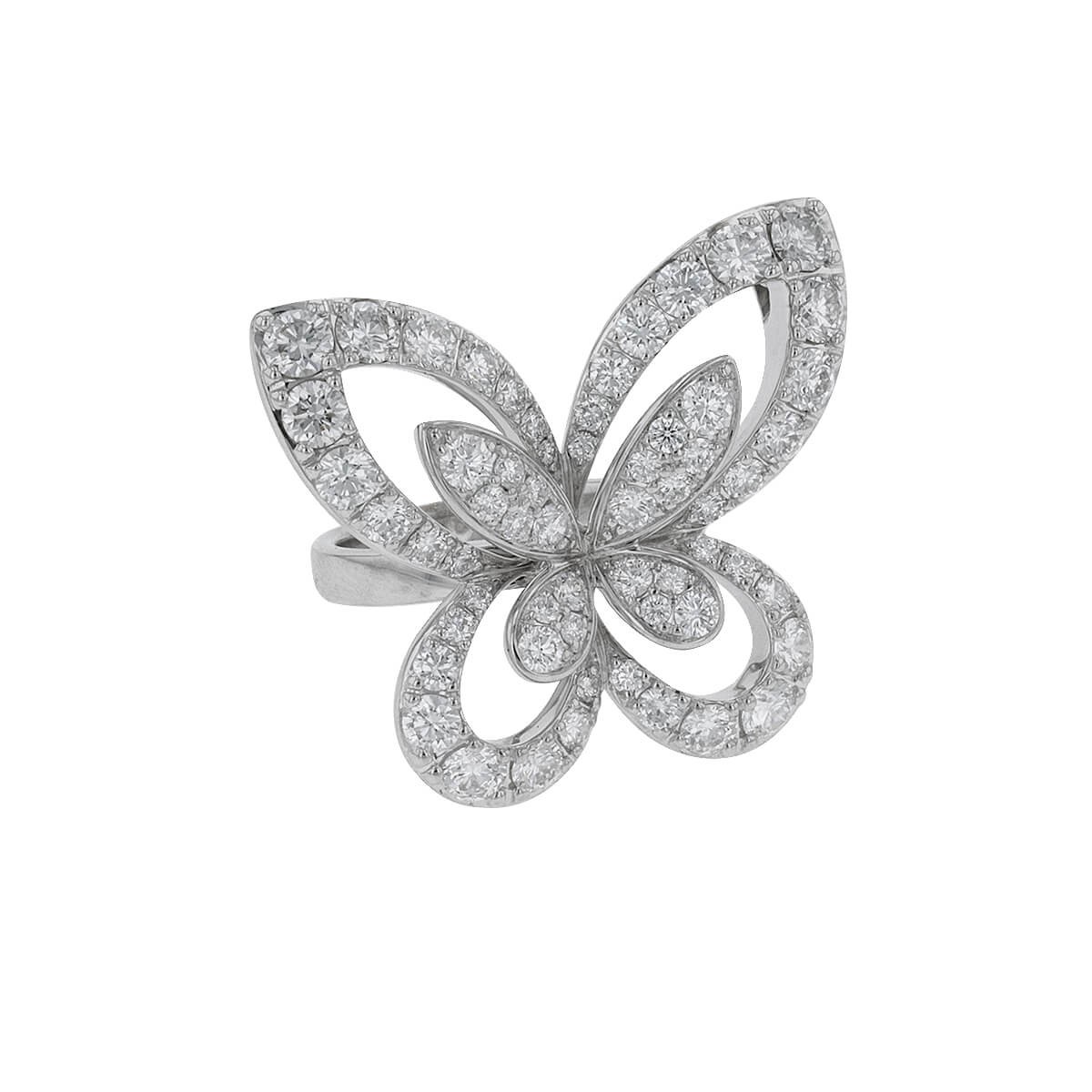 Bague en or blanc, centrée d’un important motif de papillon serti de diamants pour un poids total d’environ 2,17 cts. Motif pendentif Butterfly Silhouette de la maison Graff transformé en bague.