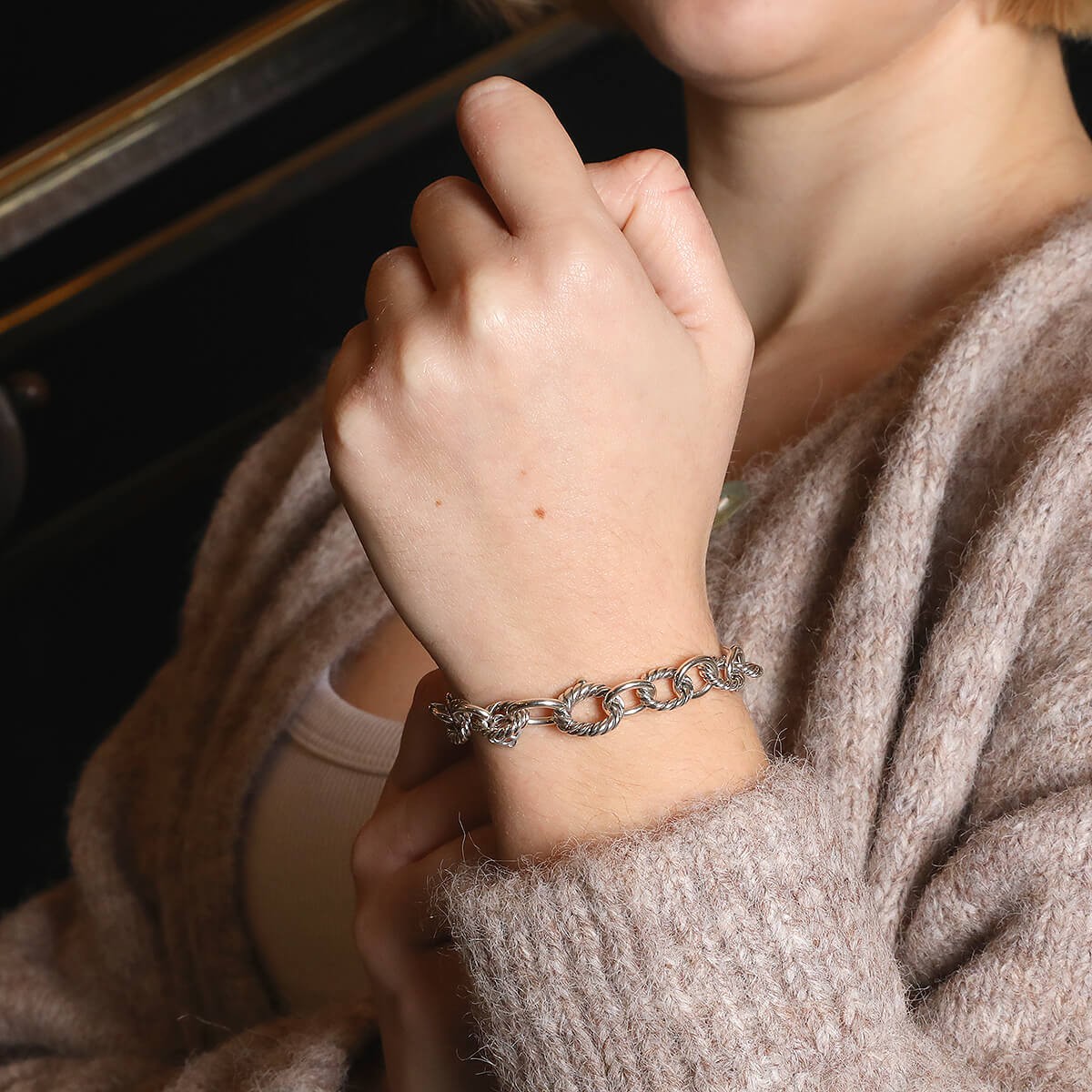 Bracelet en argent, ponctué d’anneaux lisses et motif cordage, agrémenté d’un fermoir mousqueton invisible. Signé.