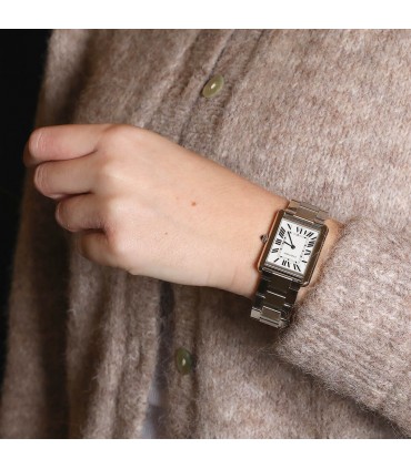 Montre bracelet en acier, cadran argenté avec chiffres romains et chemin de fer pour les minutes. Mouvement quartz. Bracelet en acier, maillons articulés avec boucle déployante en acier. Signée et numérotée.