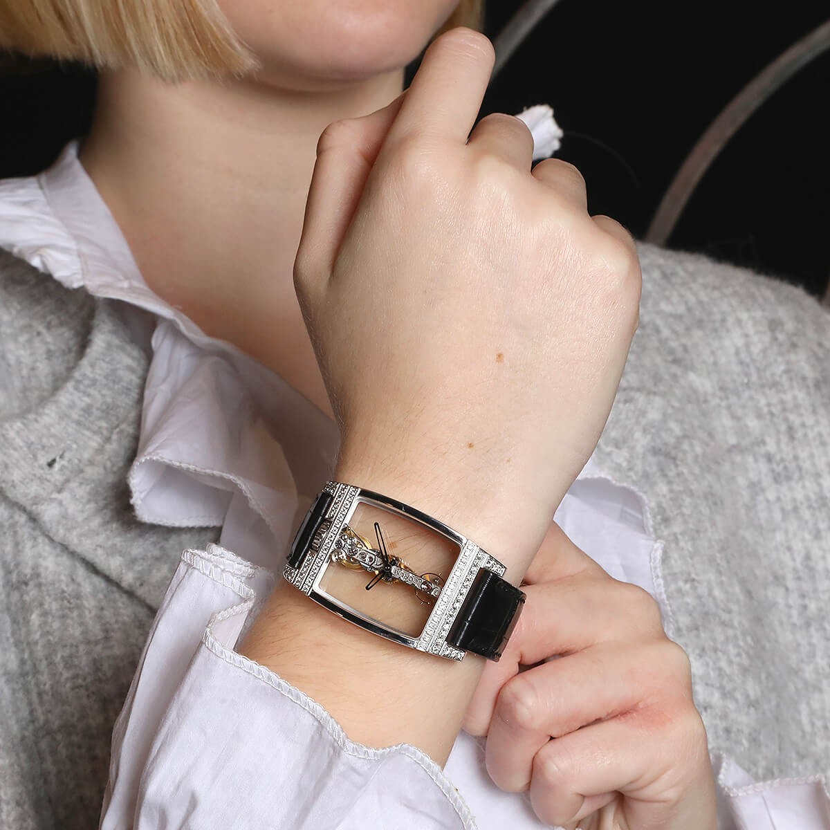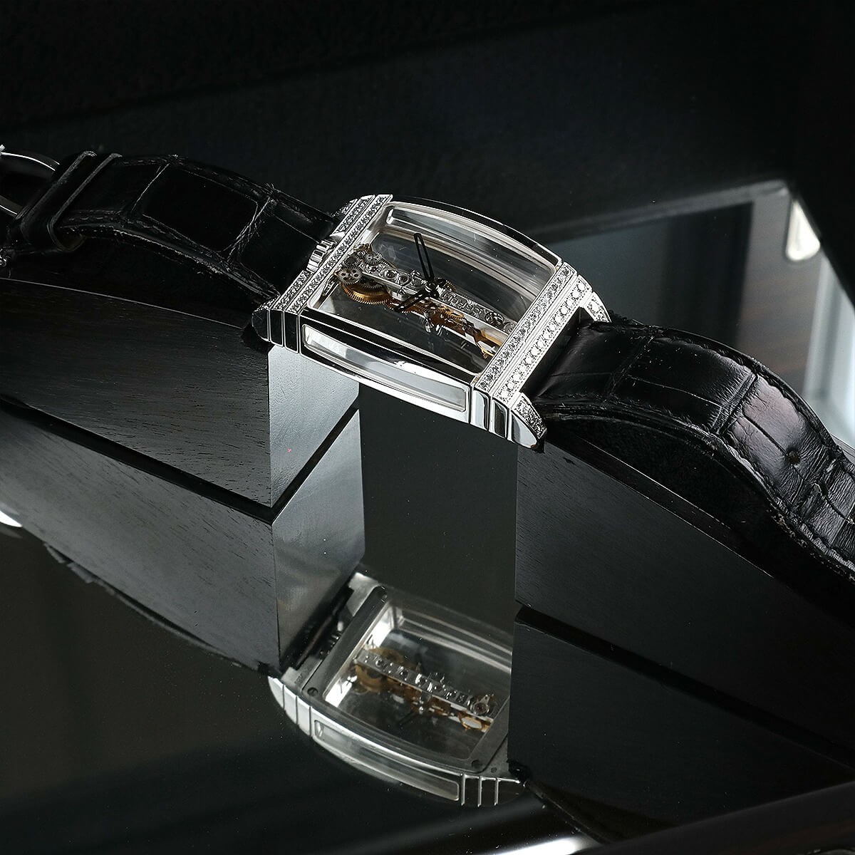 Montre en or blanc, cadran muet dévoilant son mouvement mécanique linéaire, lunette tonneau partiellement sertie de diamants et dévoilant son mouvement sur ses quatre faces. Bracelet crocodile noir avec boucle ardillon en or blanc. Signée et numérotée.
