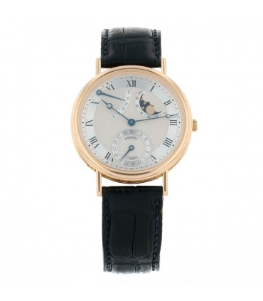Montre bracelet en or jaune, cadran argenté partiellement guilloché avec chiffres romains, chemin de fer pour les minutes, Indicateur des phases de lune et d’une réserve de marche de 50 heures, petite trotteuse à 6 heures. Mouvement mécanique. Bracelet neuf rapporté en crocodile noir avec boucle ardillon en or jaune. Signée et numérotée.