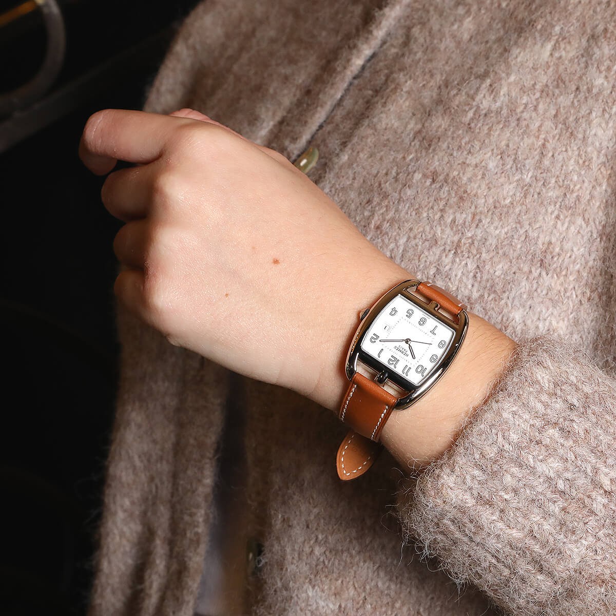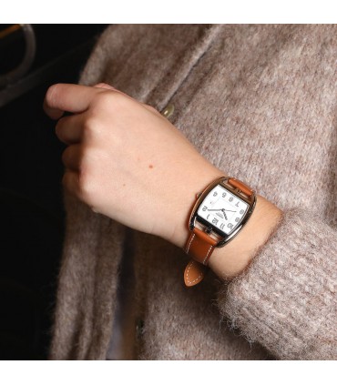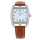 Montre bracelet en acier grand modèle, cadran blanc avec chiffres arabes, affichage de la date par guichet à 3 heures, lunette stylisée. Mouvement quartz. Bracelet signé en cuir marron avec boucle ardillon en acier. Signée et numérotée.