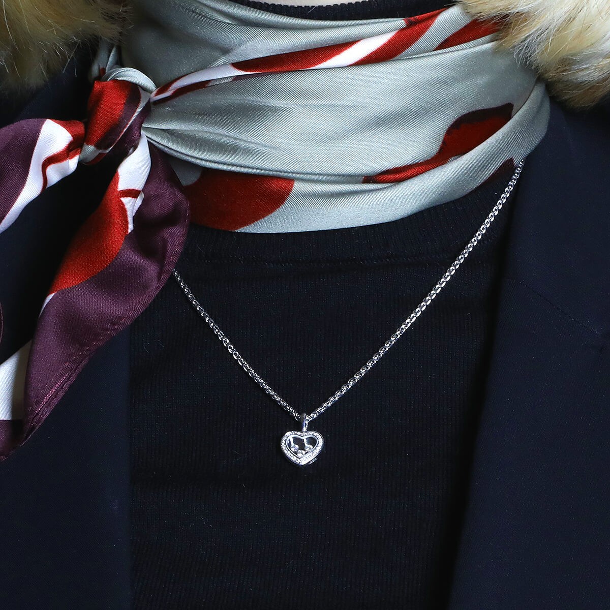 Collier en or blanc, maille palmier, centré d’un pendentif coeur orné de diamants retenant trois diamants mobiles en serti clos, agrémenté d’un fermoir mousqueton. Signé.