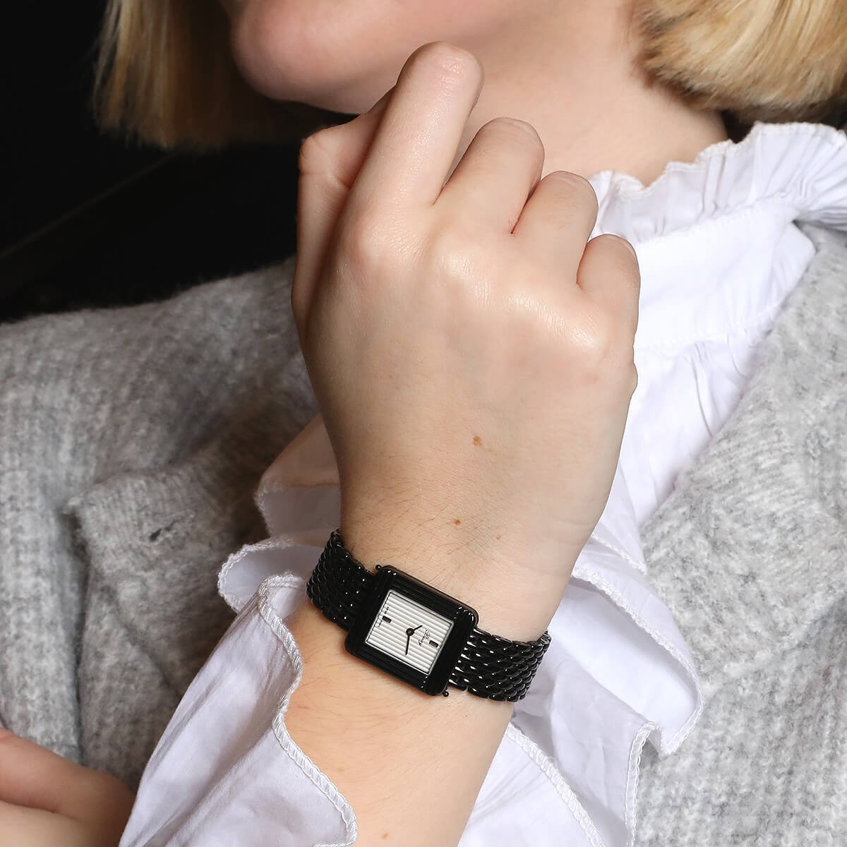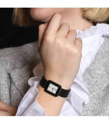 Montre bracelet de femme en PVD noir, cadran blanc à décor rainuré avec index appliqués, lunette godronnée. Mouvement quartz. Bracelet interchangeable en PVD noir, maillons grain de riz avec boucle déployante en acier. Signée et numérotée. Accompagnée de 4 bracelets supplémentaires signés couleur bleu, noire verni, rose et grise.