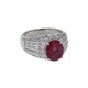 Bague en or blanc, centrée d’un rubis taille ovale couleur framboise d’environ 3,7 cts dans en entourage de diamants taille baguette et de diamant ronds facettés sur les tranches.