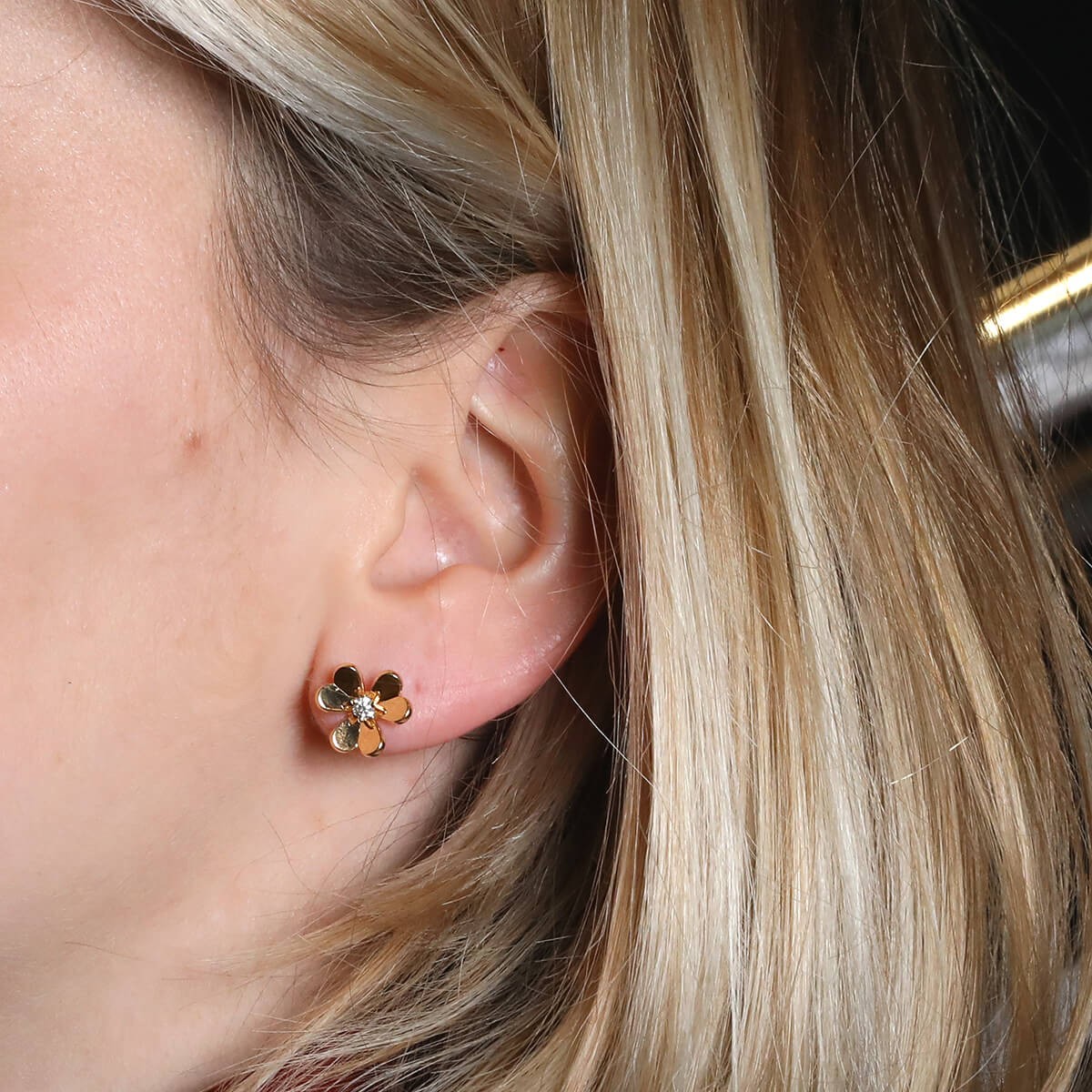 Boucles d’oreilles mini modèle en or jaune, stylisant une fleur centrée d’un diamant. Signées et numérotées.