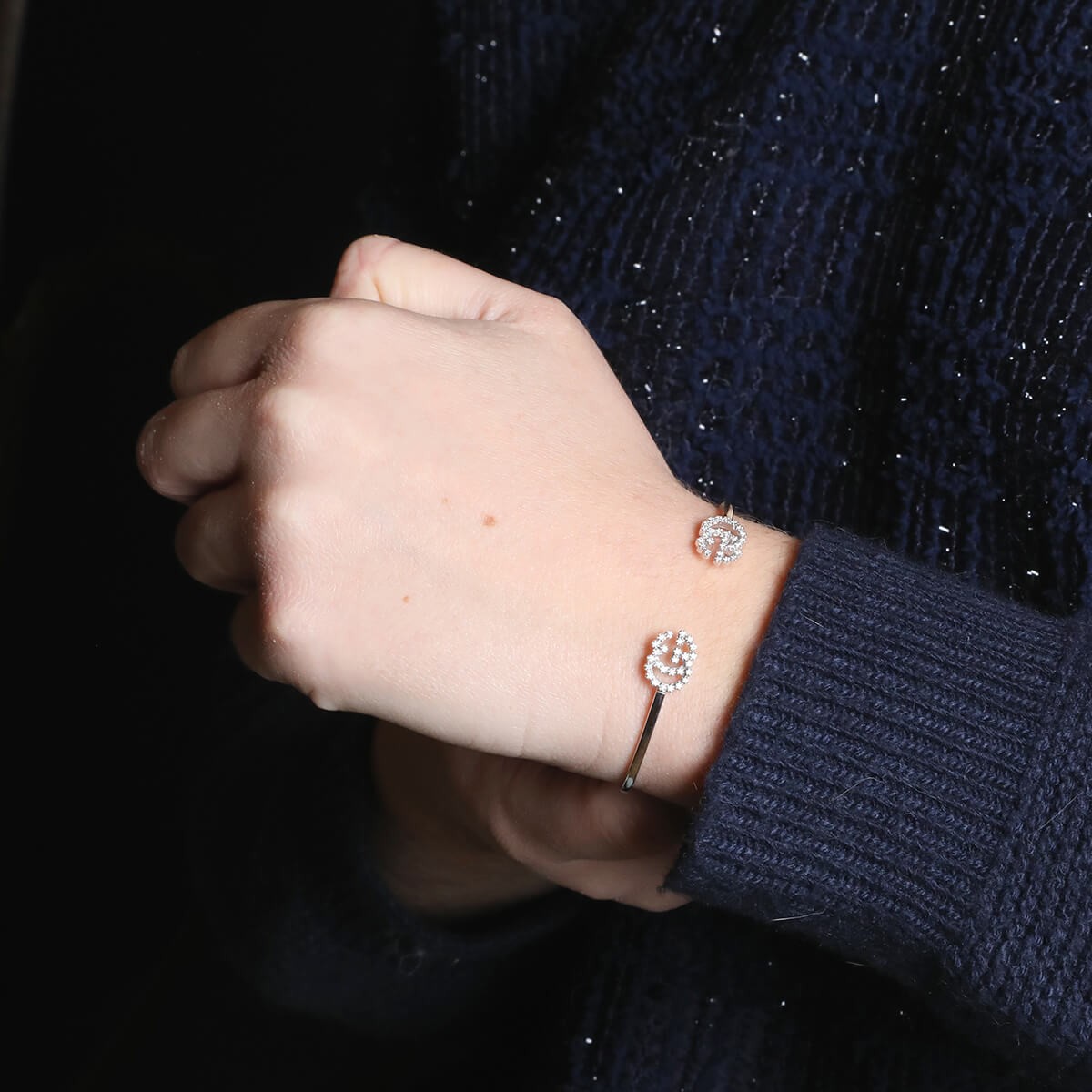 Bracelet jonc ouvert en or blanc, centré des double G de Gucci sertis de diamants. Signé.