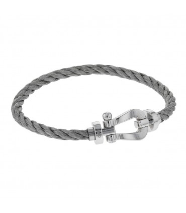 Bracelet grand modèle, composé d’une manille en or blanc et d’un câble amovible en acier torsadé. Signé et numéroté.