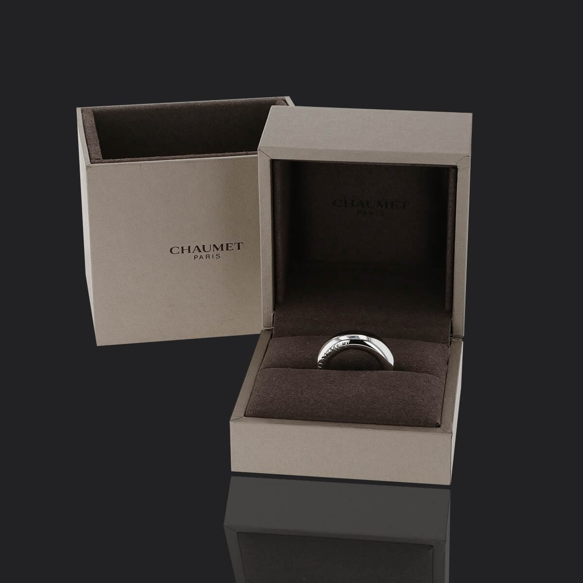 Bague en or blanc stylisant un jonc, rehaussé de l’inscription Chaumet en gravure. Signée et numérotée