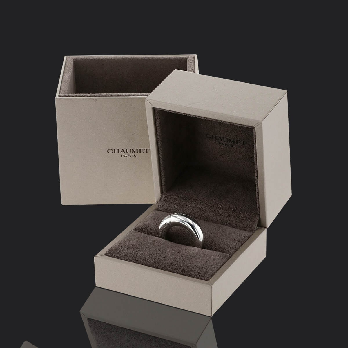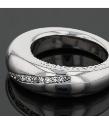 Bague en or blanc stylisant un jonc, serti d’une ligne de diamants et rehaussé de l’inscription Chaumet en gravure. Signée et numérotée