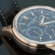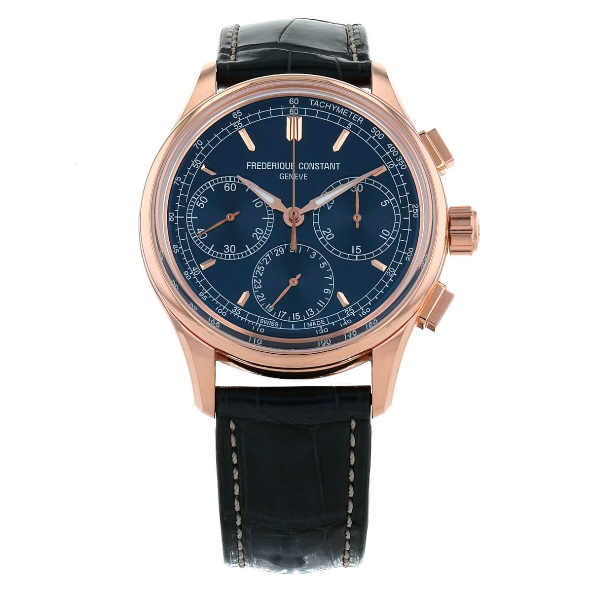 Montre chronographe d’homme en acier plaqué or rose, cadran gris rayonnant 3 compteurs avec index appliqués, affichage de la date par compteur à 6 heures, fonction flyback. Fond de boîte transparent dévoilant son mouvement automatique. Bracelet en crocodile bleu avec boucle déployante réglable en acier plaqué or rose. Signée et numérotée.