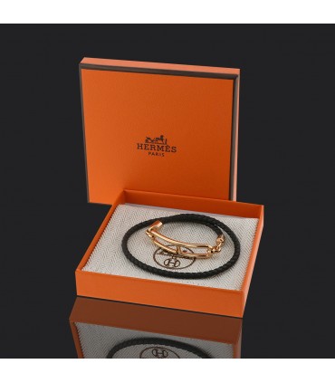 Bracelet en or rose et cuir tressé noir, centré de l’iconique fermoir Roulis. Signé et numéroté. Avec plastiques de protection.