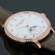 Montre bracelet de femme en acier plaqué or rose, cadran argenté avec index appliqués et diamants, affichage de la date et de la phase de lune par compteur à 6 heures, lunette ronde sertie de diamants. Fond de boîte transparent dévoilant son mouvement automatique. Bracelet en crocodile marron verni avec boucle déployante réglable en acier plaqué or rose. Signée et numérotée.