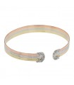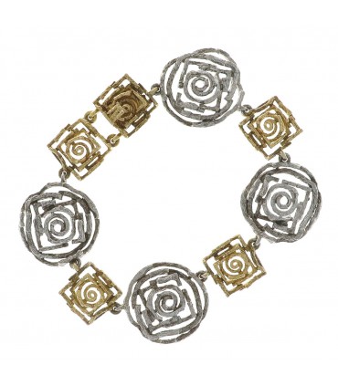 Bracelet 2 tons d’or, ponctué de 4 motifs ronds en or blanc texturé ajouré et de 5 motifs carrés en or jaune texturé ajouré, agrémenté d’un fermoir à cliquet. Signé.