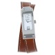 Montre bracelet de femme en acier, cadran blanc avec chiffres arabes appliqués, lunette stylisée. Mouvement quartz. Bracelet signé usagé en cuir marron double tour avec boucle ardillon en acier signée. Signée et numérotée.
