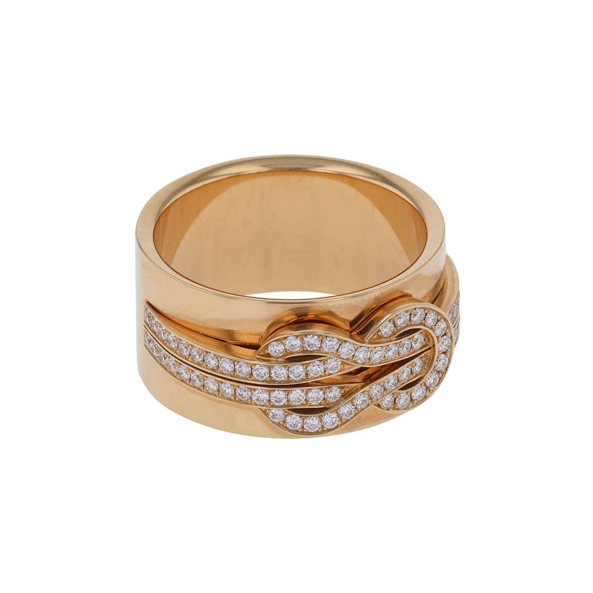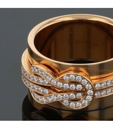 Bague en or rose, formée d’un large bandeau centré d’un motif noeud d’hercule rehaussé d’un pavage de diamants. Signée et numérotée.