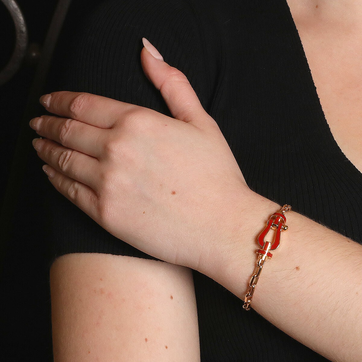 Bracelet grand modèle composé d’une maille ovale ajourée en or rose, agrémentée d’un fermoir en or rose ajouré stylisant une manille en émail rouge. Signé et numéroté.
