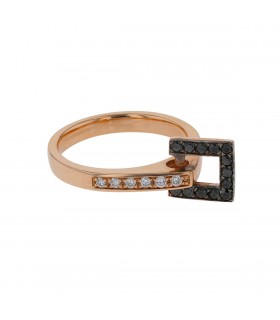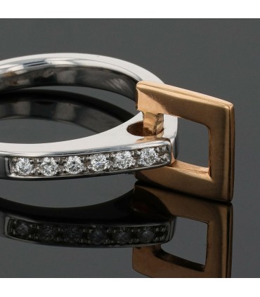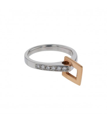 Bague en or blanc, monture à décor de pointe partiellement sertie de diamants retenant un motif en mouvement carré en or rose. Signée.